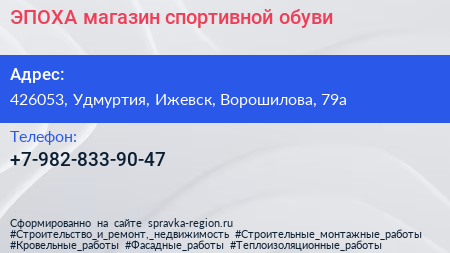 ЭПОХА, магазин спортивной обуви по адресу 426053, Удмуртия, Ижевск, Ворошилова, 79а в дальнейшем Организация, размещена в следующих категориях: