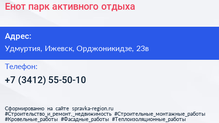 Енот, парк активного отдыха по адресу Удмуртия, Ижевск, Орджоникидзе, 23в в дальнейшем Организация, размещена в следующих категориях: