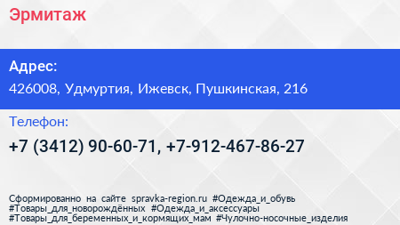 Эрмитаж по адресу 426008, Удмуртия, Ижевск, Пушкинская, 216 в дальнейшем Организация, размещена в следующих категориях: