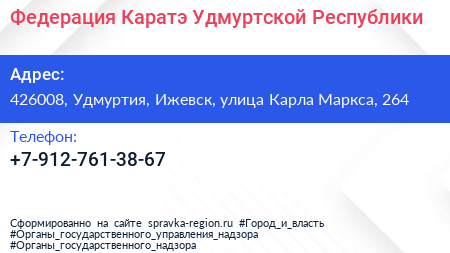 Федерация Каратэ Удмуртской Республики по адресу 426008, Удмуртия, Ижевск, улица Карла Маркса, 264 в дальнейшем Организация, размещена в следующих категориях:
