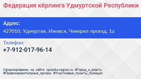 Федерация кёрлинга Удмуртской Республики по адресу 427010, Удмуртия, Ижевск, Чекерил проезд, 1а в дальнейшем Организация, размещена в следующих категориях: