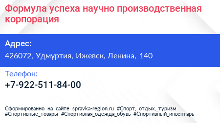 Формула успеха, научно-производственная корпорация по адресу 426072, Удмуртия, Ижевск, Ленина, 140 в дальнейшем Организация, размещена в следующих категориях: