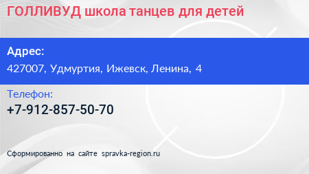 ГОЛЛИВУД, школа танцев для детей по адресу 427007, Удмуртия, Ижевск, Ленина, 4 в дальнейшем Организация, размещена в следующих категориях: