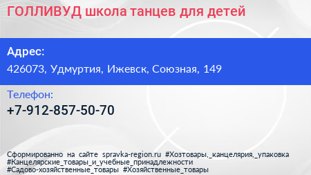ГОЛЛИВУД, школа танцев для детей по адресу 426073, Удмуртия, Ижевск, Союзная, 149 в дальнейшем Организация, размещена в следующих категориях:
