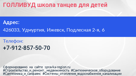 ГОЛЛИВУД, школа танцев для детей по адресу 426033, Удмуртия, Ижевск, Подлесная 2-я, 6 в дальнейшем Организация, размещена в следующих категориях:
