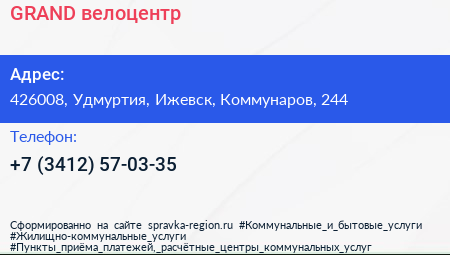 GRAND, велоцентр по адресу 426008, Удмуртия, Ижевск, Коммунаров, 244 в дальнейшем Организация, размещена в следующих категориях: