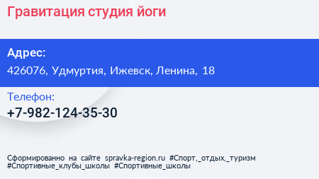 Гравитация, студия йоги по адресу 426076, Удмуртия, Ижевск, Ленина, 18 в дальнейшем Организация, размещена в следующих категориях: