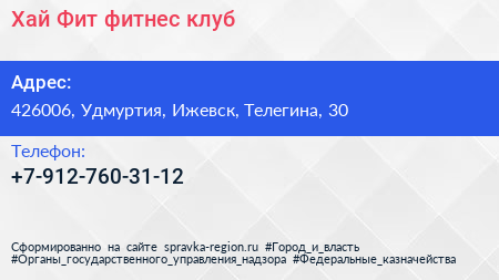 Хай-Фит, фитнес-клуб по адресу 426006, Удмуртия, Ижевск, Телегина, 30 в дальнейшем Организация, размещена в следующих категориях:
