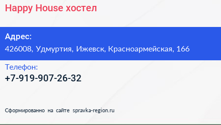 Happy House, хостел по адресу 426008, Удмуртия, Ижевск, Красноармейская, 166 в дальнейшем Организация, размещена в следующих категориях: