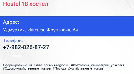 Hostel 18, хостел по адресу Удмуртия, Ижевск, Фруктовая, 6а в дальнейшем Организация, размещена в следующих категориях: