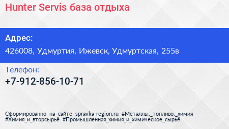 Hunter-Servis, база отдыха по адресу 426008, Удмуртия, Ижевск, Удмуртская, 255в в дальнейшем Организация, размещена в следующих категориях: