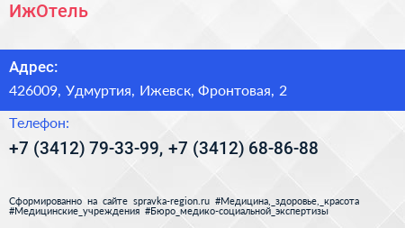 ИжОтель по адресу 426009, Удмуртия, Ижевск, Фронтовая, 2 в дальнейшем Организация, размещена в следующих категориях: