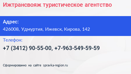 Ижтрансвояж, туристическое агентство по адресу 426008, Удмуртия, Ижевск, Кирова, 142 в дальнейшем Организация, размещена в следующих категориях: