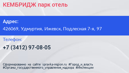 КЕМБРИДЖ, парк-отель по адресу 426069, Удмуртия, Ижевск, Подлесная 7-я, 97 в дальнейшем Организация, размещена в следующих категориях: