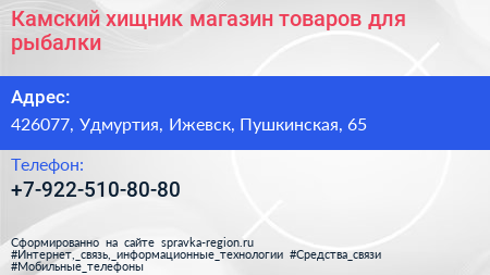 Камский хищник, магазин товаров для рыбалки по адресу 426077, Удмуртия, Ижевск, Пушкинская, 65 в дальнейшем Организация, размещена в следующих категориях: