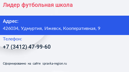 Лидер, футбольная школа по адресу 426034, Удмуртия, Ижевск, Кооперативная, 9 в дальнейшем Организация, размещена в следующих категориях: