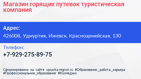 Магазин горящих путевок, туристическая компания по адресу 426008, Удмуртия, Ижевск, Красноармейская, 130 в дальнейшем Организация, размещена в следующих категориях:
