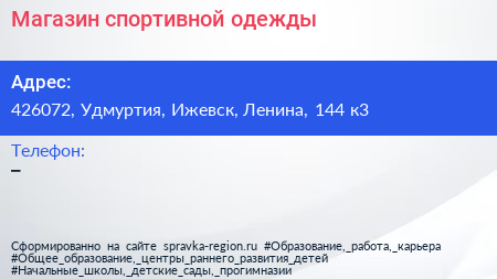 Магазин спортивной одежды по адресу 426072, Удмуртия, Ижевск, Ленина, 144 к3 в дальнейшем Организация, размещена в следующих категориях: