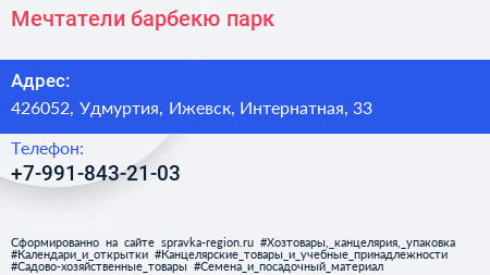 Мечтатели, барбекю-парк по адресу 426052, Удмуртия, Ижевск, Интернатная, 33 в дальнейшем Организация, размещена в следующих категориях: