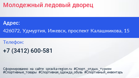 Молодежный, ледовый дворец по адресу 426072, Удмуртия, Ижевск, проспект Калашникова, 15 в дальнейшем Организация, размещена в следующих категориях: