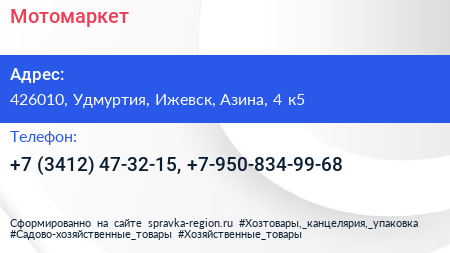 Мотомаркет по адресу 426010, Удмуртия, Ижевск, Азина, 4 к5 в дальнейшем Организация, размещена в следующих категориях:
