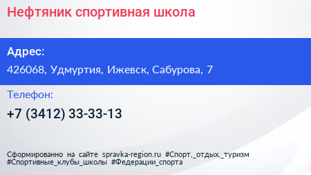 Нефтяник, спортивная школа по адресу 426068, Удмуртия, Ижевск, Сабурова, 7 в дальнейшем Организация, размещена в следующих категориях: