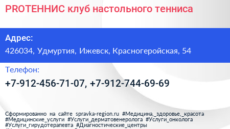 PROТЕННИС, клуб настольного тенниса по адресу 426034, Удмуртия, Ижевск, Красногеройская, 54 в дальнейшем Организация, размещена в следующих категориях: