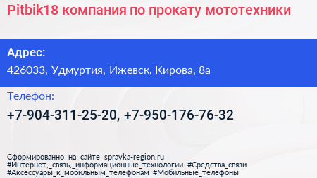 Pitbik18, компания по прокату мототехники по адресу 426033, Удмуртия, Ижевск, Кирова, 8а в дальнейшем Организация, размещена в следующих категориях: