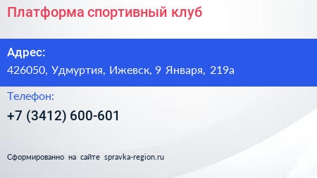 Платформа, спортивный клуб по адресу 426050, Удмуртия, Ижевск, 9 Января, 219а в дальнейшем Организация, размещена в следующих категориях: