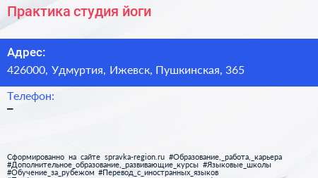 Практика, студия йоги по адресу 426000, Удмуртия, Ижевск, Пушкинская, 365 в дальнейшем Организация, размещена в следующих категориях: