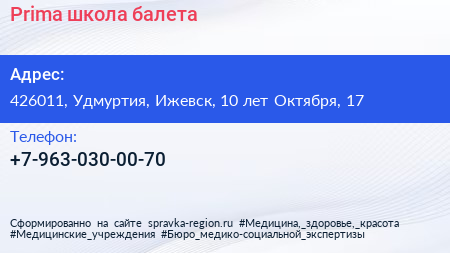Prima, школа балета по адресу 426011, Удмуртия, Ижевск, 10 лет Октября, 17 в дальнейшем Организация, размещена в следующих категориях: