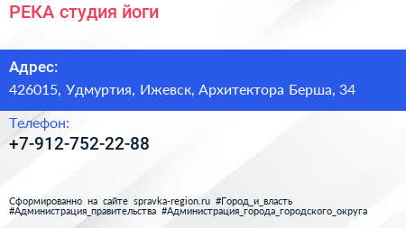 РЕКА, студия йоги по адресу 426015, Удмуртия, Ижевск, Архитектора Берша, 34 в дальнейшем Организация, размещена в следующих категориях:
