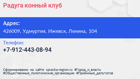 Радуга, конный клуб по адресу 426009, Удмуртия, Ижевск, Ленина, 104 в дальнейшем Организация, размещена в следующих категориях: