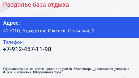 Раздолье, база отдыха по адресу 427010, Удмуртия, Ижевск, Сельская, 2 в дальнейшем Организация, размещена в следующих категориях:
