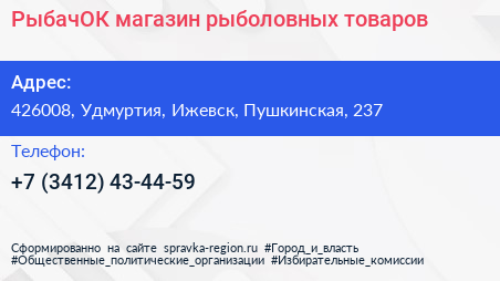 РыбачОК, магазин рыболовных товаров по адресу 426008, Удмуртия, Ижевск, Пушкинская, 237 в дальнейшем Организация, размещена в следующих категориях: