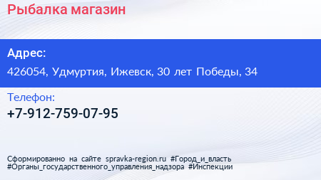Рыбалка, магазин по адресу 426054, Удмуртия, Ижевск, 30 лет Победы, 34 в дальнейшем Организация, размещена в следующих категориях:
