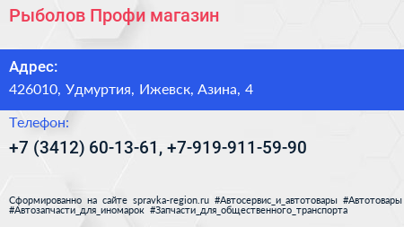 Рыболов-Профи, магазин по адресу 426010, Удмуртия, Ижевск, Азина, 4 в дальнейшем Организация, размещена в следующих категориях: