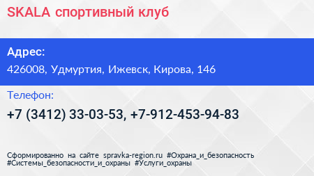 SKALA, спортивный клуб по адресу 426008, Удмуртия, Ижевск, Кирова, 146 в дальнейшем Организация, размещена в следующих категориях: