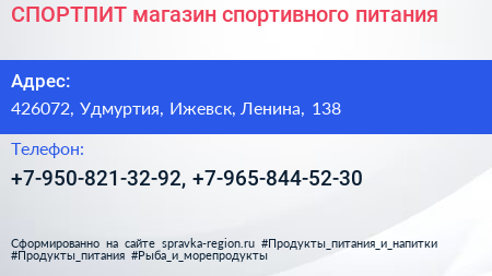 СПОРТПИТ, магазин спортивного питания по адресу 426072, Удмуртия, Ижевск, Ленина, 138 в дальнейшем Организация, размещена в следующих категориях:
