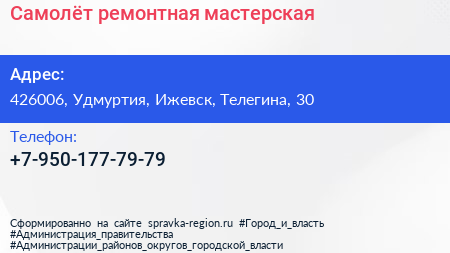 Самолёт, ремонтная мастерская по адресу 426006, Удмуртия, Ижевск, Телегина, 30 в дальнейшем Организация, размещена в следующих категориях: