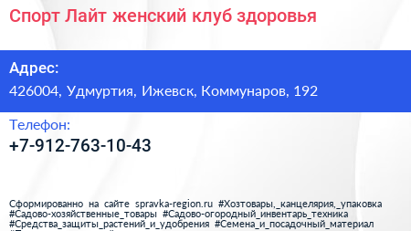 Спорт Лайт, женский клуб здоровья по адресу 426004, Удмуртия, Ижевск, Коммунаров, 192 в дальнейшем Организация, размещена в следующих категориях: