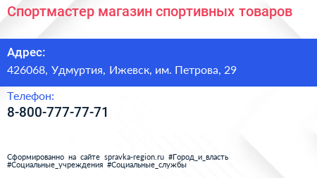 Спортмастер, магазин спортивных товаров по адресу 426068, Удмуртия, Ижевск, им. Петрова, 29 в дальнейшем Организация, размещена в следующих категориях: