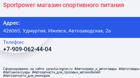 Sportpower, магазин спортивного питания по адресу 426065, Удмуртия, Ижевск, Автозаводская, 2а в дальнейшем Организация, размещена в следующих категориях: