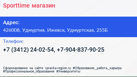 Sporttime, магазин по адресу 426008, Удмуртия, Ижевск, Удмуртская, 255Б в дальнейшем Организация, размещена в следующих категориях: