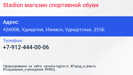 Stadion, магазин спортивной обуви по адресу 426008, Удмуртия, Ижевск, Удмуртская, 255Б в дальнейшем Организация, размещена в следующих категориях: