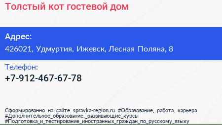 Толстый кот, гостевой дом по адресу 426021, Удмуртия, Ижевск, Лесная Поляна, 8 в дальнейшем Организация, размещена в следующих категориях: