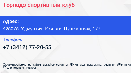 Торнадо, спортивный клуб по адресу 426076, Удмуртия, Ижевск, Пушкинская, 177 в дальнейшем Организация, размещена в следующих категориях: