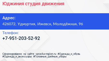 Юджиния, студия движения по адресу 426072, Удмуртия, Ижевск, Молодёжная, 96 в дальнейшем Организация, размещена в следующих категориях: