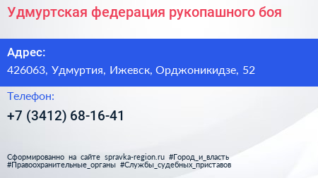 Удмуртская федерация рукопашного боя по адресу 426063, Удмуртия, Ижевск, Орджоникидзе, 52 в дальнейшем Организация, размещена в следующих категориях: