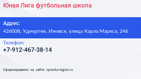 Юная Лига, футбольная школа по адресу 426008, Удмуртия, Ижевск, улица Карла Маркса, 246 в дальнейшем Организация, размещена в следующих категориях: